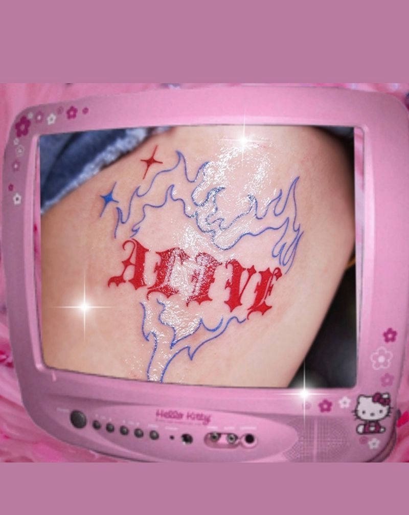 当前位置: 首页 >山东省济南市纹身店-反骨刺青纹身工作室纹身图案>ALIVE纹身图片_腿部Old School花体字火焰线条纹身图案