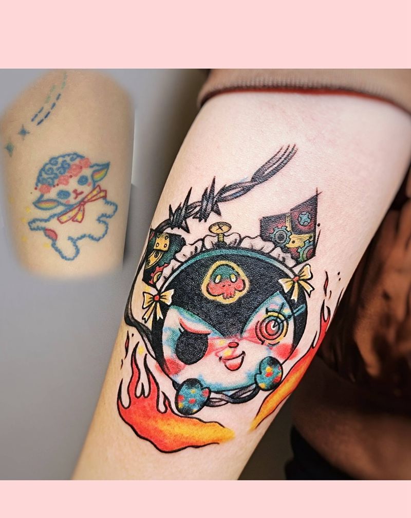 当前位置: 首页 >山东省济南市纹身店-反骨刺青纹身工作室纹身图案>库洛米遮盖纹身图片_手臂Old School遮盖纹身图案