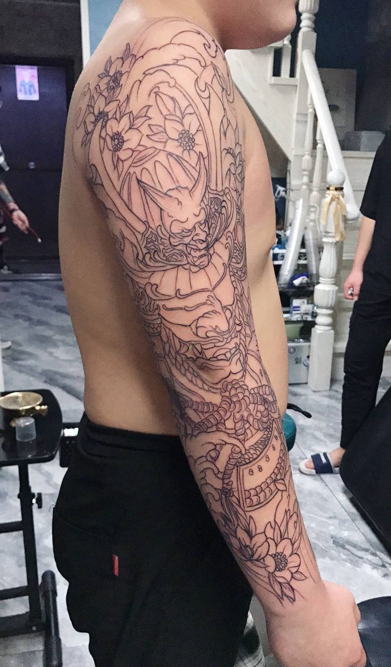鬼武士花臂线条纹身图片_腿部手臂老传统新传统纹身图案