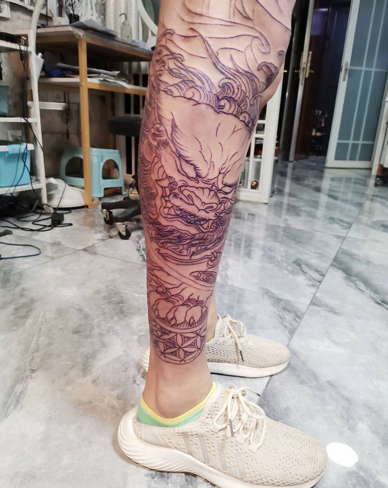 • T网红王老大花腿龙纹身图片_腿部新传统纹身图案