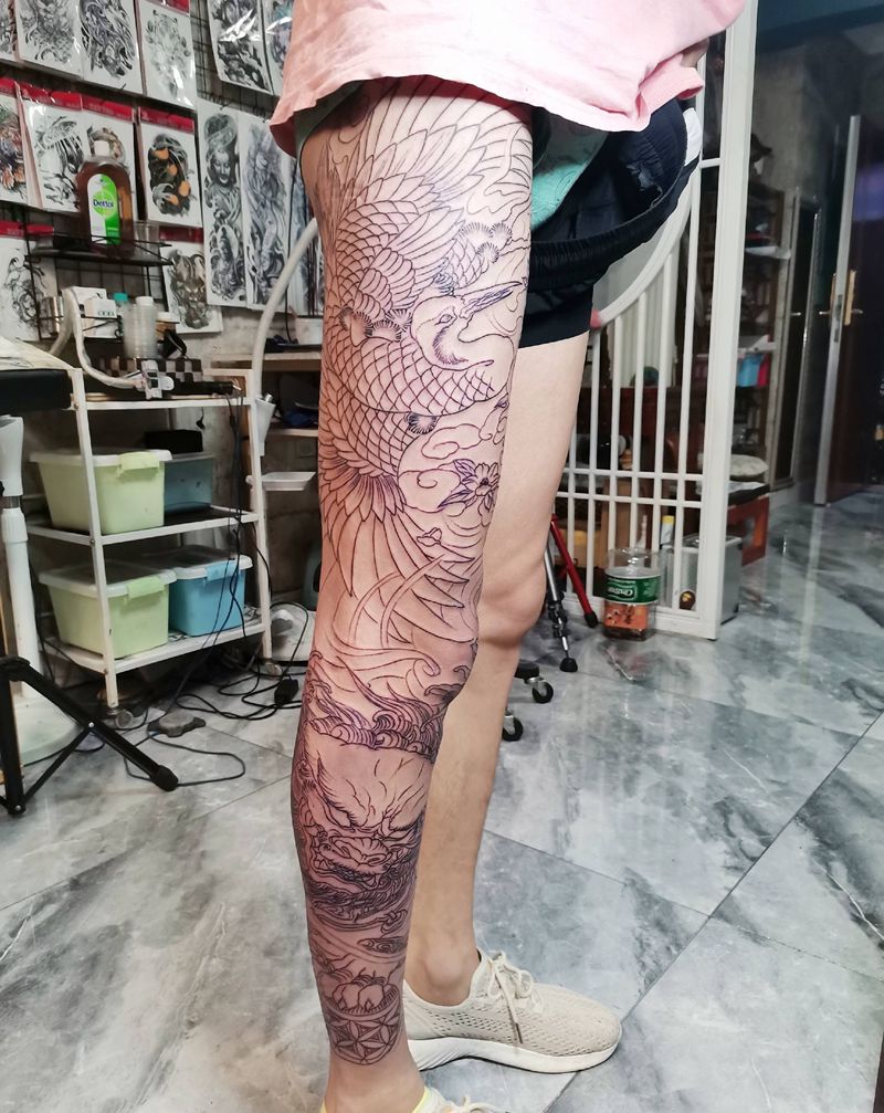 • T网红王老大花腿龙纹身图片_腿部新传统纹身图案