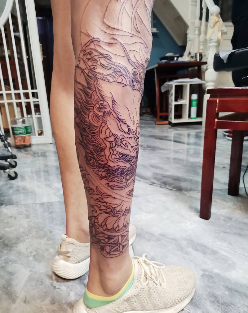 • T网红王老大花腿龙纹身图片_腿部新传统纹身图案