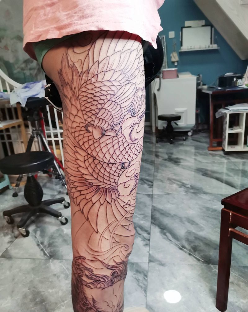 • T网红王老大花腿龙纹身图片_腿部新传统纹身图案