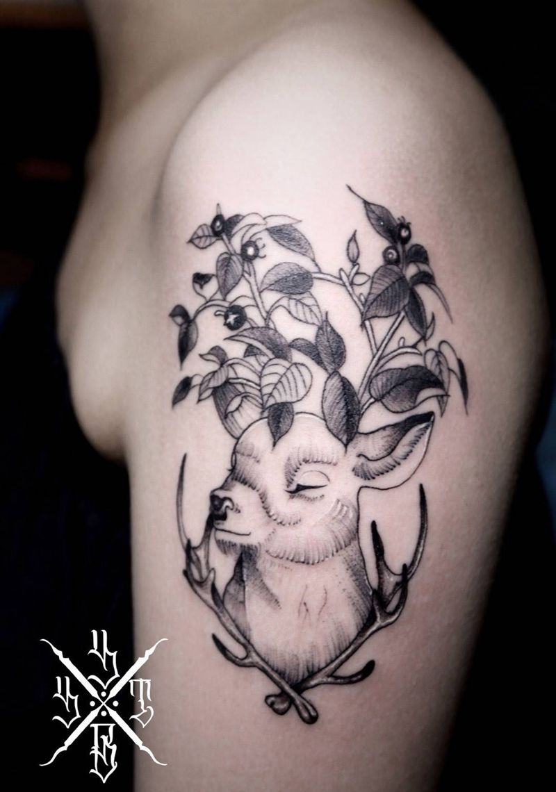 当前位置: 首页 >山东省济南市纹身店-云天宗刺青纹身图案>鹿和经文纹身图片_成品肩部清新动物纹身图案