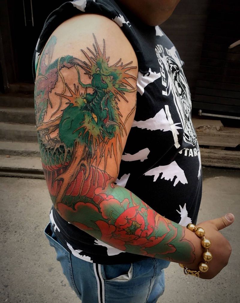 • T网红王老大花腿龙纹身图片_腿部新传统纹身图案