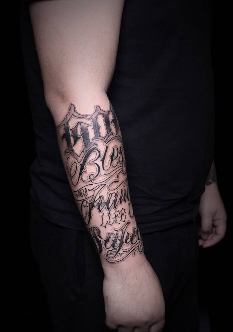 当前位置: 首页 >山东省济南市纹身店-云天宗刺青纹身图案>花体字纹身图片_成品手臂欧美字符纹身图案