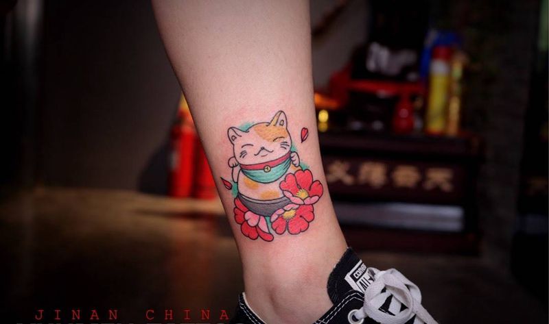 招财猫!纹身图片_成品腿部欧美动物原创纹身图案