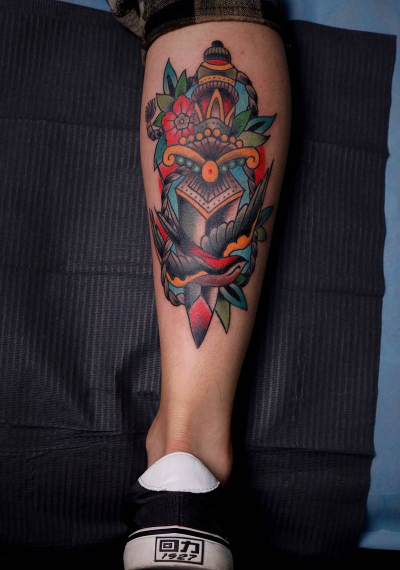 • T包小腿吹火男+阿多福纹身图片_腿部老传统新传统吹火男阿