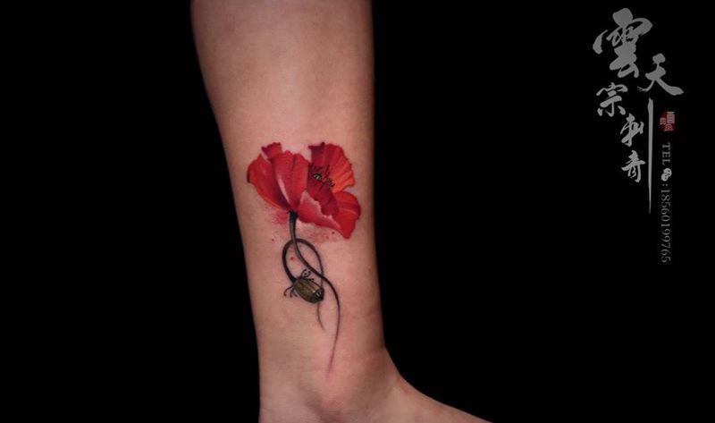 当前位置: 首页 >山东省济南市纹身店-云天宗刺青纹身图案>罂粟花纹身图片_成品腿部国画清新静物植物纹身图案