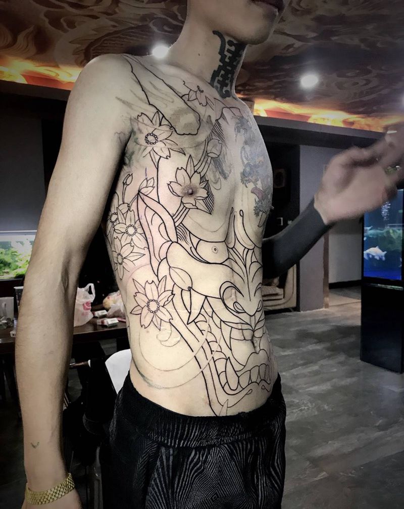 • T网红王老大花腿龙纹身图片_腿部新传统纹身图案