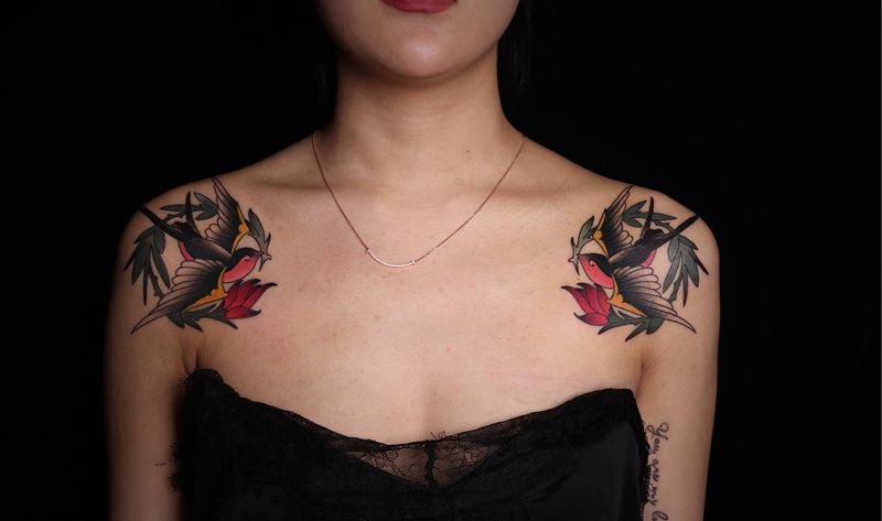 燕子纹身图片_肩部New School纹身图案