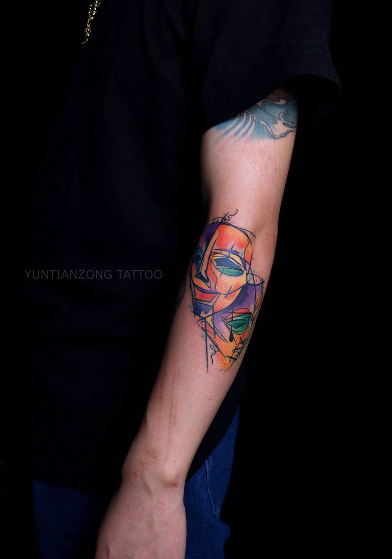 当前位置: 首页 >山东省济南市纹身店-云天宗刺青纹身图案>面具纹身图片_手臂New School水彩纹身图案