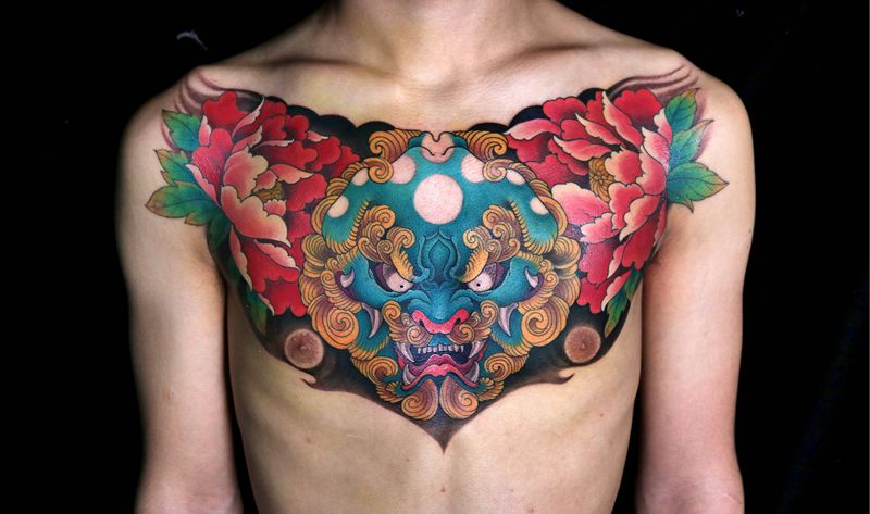 唐狮牡丹纹身图片_胸部新传统纹身图案