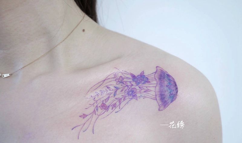 当前位置: 首页 >山东省济南市纹身店-花绣刺青纹身图案>水母纹身图片_肩部背部水墨水彩纹身图案