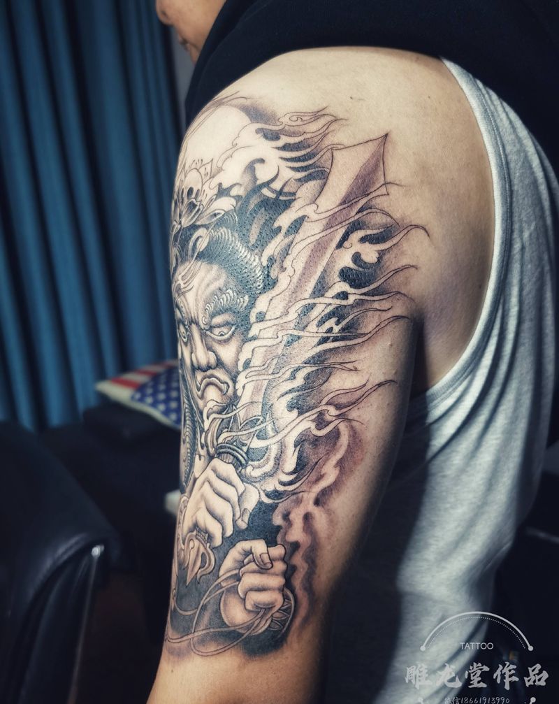 当前位置: 首页 >山东省青岛市纹身店- 雕龙堂刺青纹身图案>不动明王纹身图片_手臂新传统不动明王黑白纹身图案