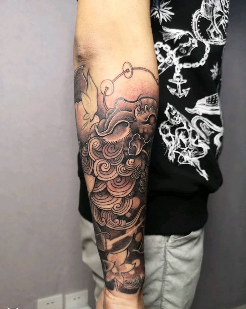唐狮子包小臂纹身图片_手臂新传统唐狮子纹身图案