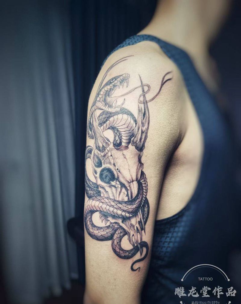 蛇与骷髅纹身图片_手臂欧美写实蛇骷髅纹身图案