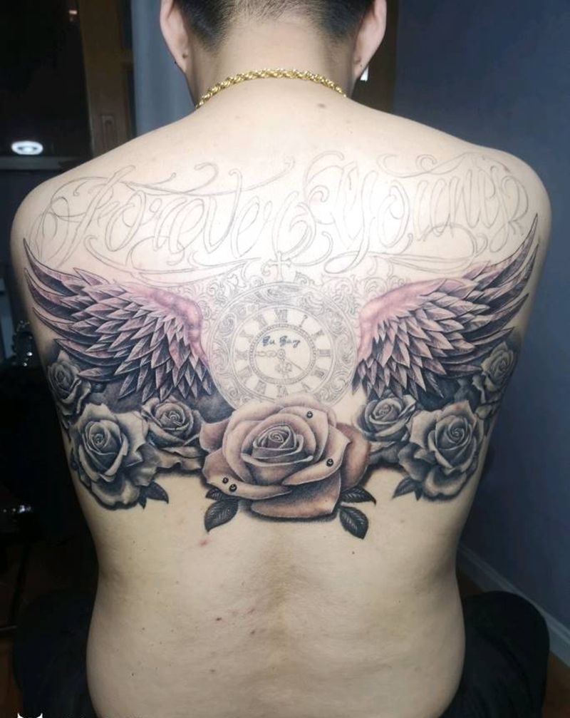 写实半背纹身图片_背部欧美写实玫瑰纹身图案