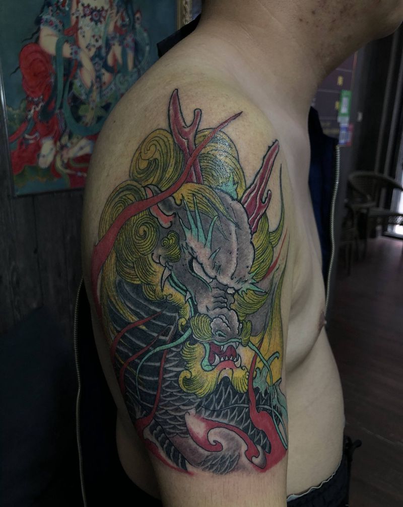 • T网红王老大花腿龙纹身图片_腿部新传统纹身图案