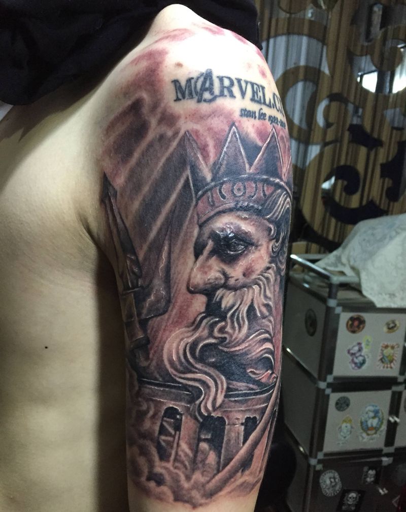 当前位置: 首页 >山东省济南市纹身店-龙啸堂刺青文化纹身图案>海神纹身图片_手臂欧美写实纹身图案