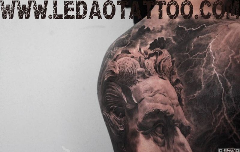 欧美雕塑写实 雷神宙斯纹身图片_成品手稿背部欧美写实肖像人物原创青岛宗教纹身图案