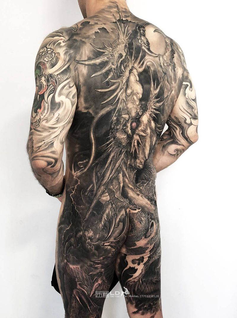 当前位置: 首页 >山东省青岛市纹身店-乐道刺青纹身图案>苍龙纹身图片_背部新传统欧美写实满背龙龙满背纹身图案