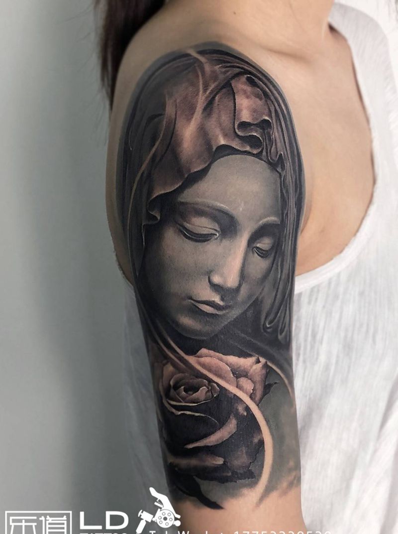 当前位置: 首页 >山东省青岛市纹身店-乐道刺青纹身图案>乐道欧美写实纹身图片_肩部手臂欧美写实圣母圣母乐道刺青纹身图案