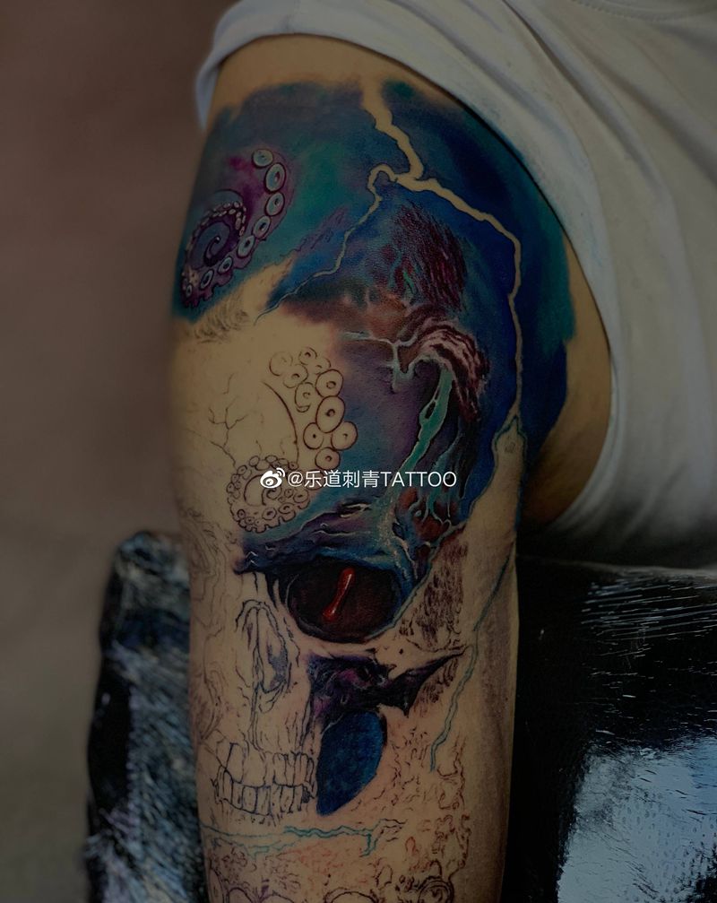 乐道叠彩纹身图片_手臂手部欧美写实乐道刺青章鱼骷髅纹身图案