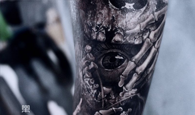 当前位置: 首页 >山东省青岛市纹身店-乐道刺青纹身图案>乐道 暗黑花臂纹身图片_手臂手部欧美写实骷髅骷髅花臂纹身图案