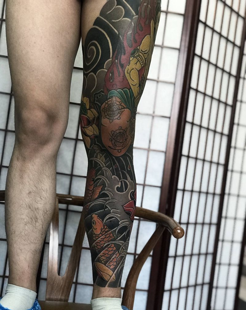 • T网红王老大花腿龙纹身图片_腿部新传统纹身图案