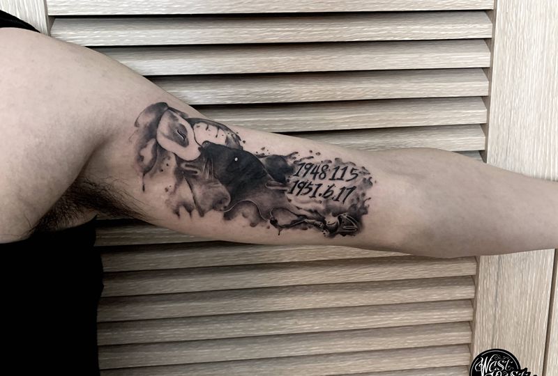 当前位置: 首页 >山东省青岛市纹身店-西海岸美术刺青纹身图案>遮盖爷爷个奶奶纹身图片_手臂欧美写实水墨纹身图案