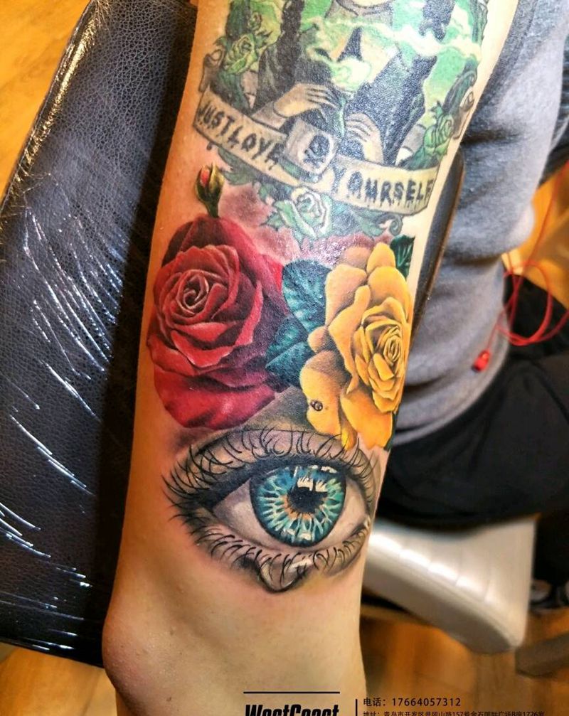 欧美眼睛玫瑰花纹身图片_肖像写实原创成品纹身图案