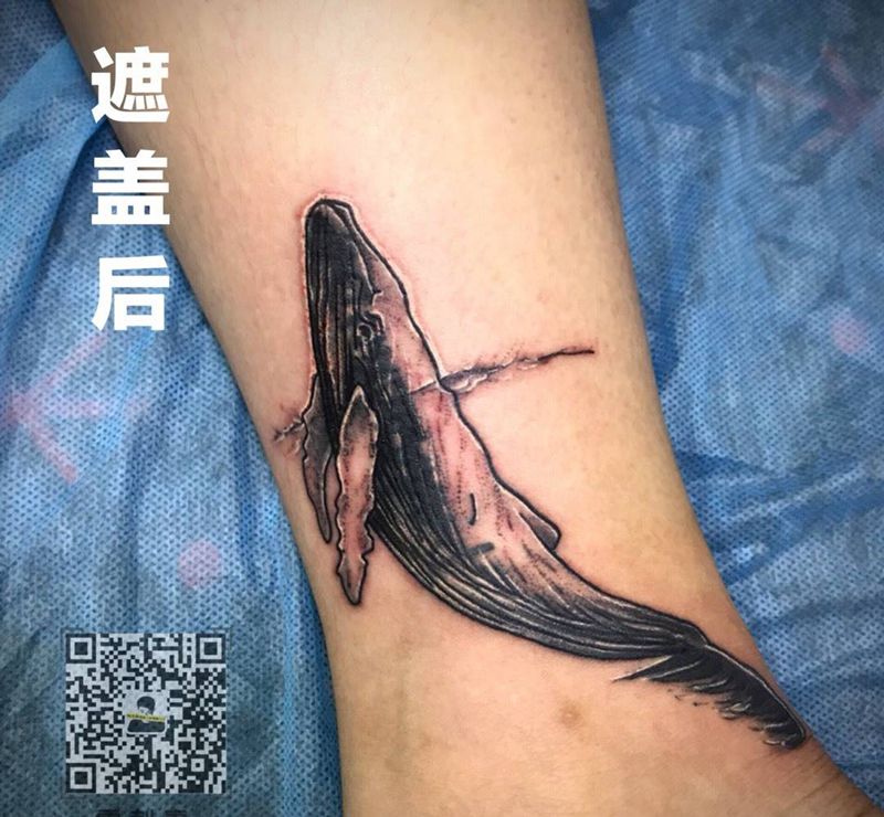 当前位置: 首页 >山东省青岛市纹身店-花田刺青纹身图案>鲸鱼遮盖纹身图片_成品腿部欧美清新几何动物雲刺青脚部静物纹身图案