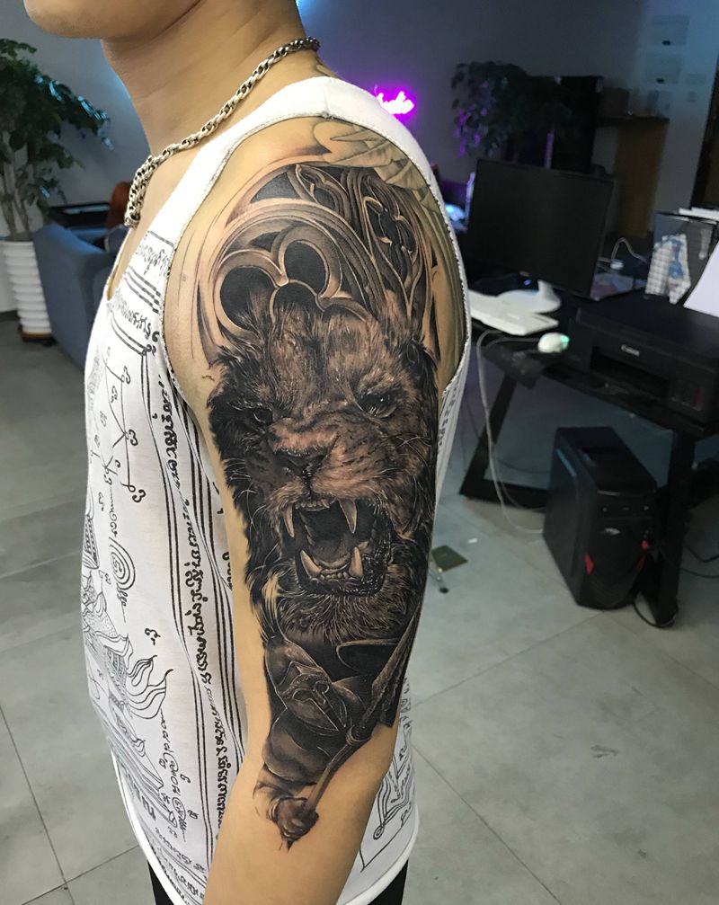 当前位置: 首页 >山东省青岛市纹身店-SKIN TICKET纹身图案>#Lion纹身图片_肩部手臂欧美写实纹身图案