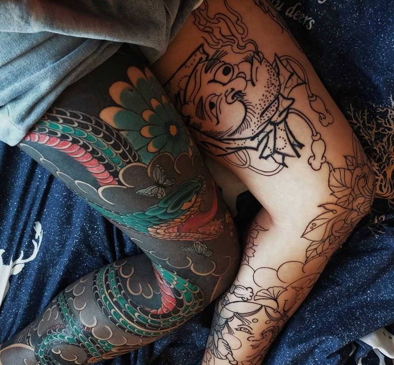 • T网红王老大花腿龙纹身图片_腿部新传统纹身图案