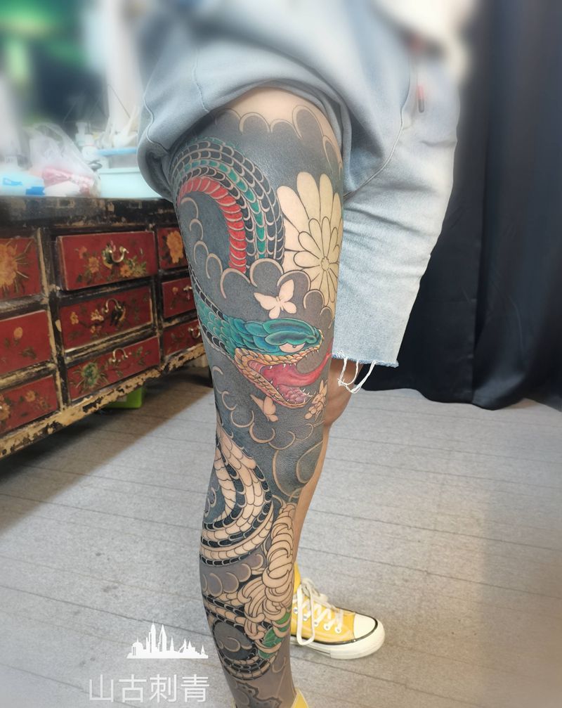 • T网红王老大花腿龙纹身图片_腿部新传统纹身图案