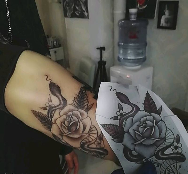 当前位置: 首页 >山东省青岛市纹身店-鬼纹阁刺青纹身图案>蛇玫瑰纹身图片_手臂纹身图案
