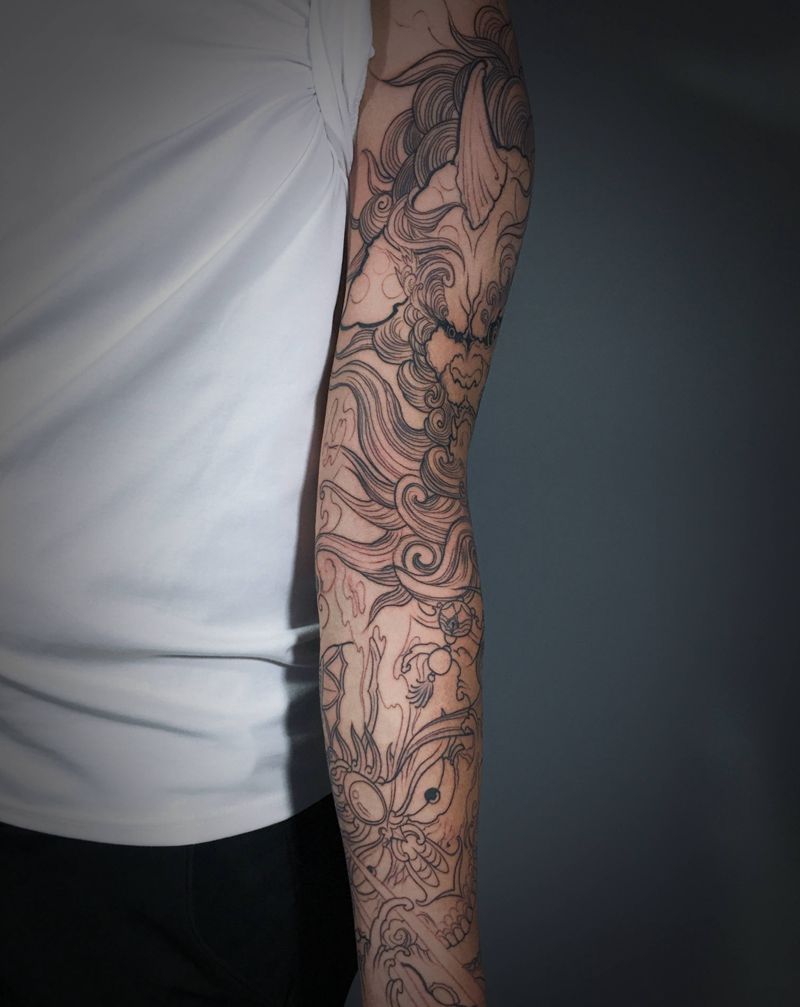 当前位置: 首页 >山东省青岛市纹身店-鬼纹阁刺青纹身图案>唐狮纹身图片_手臂新传统纹身图案