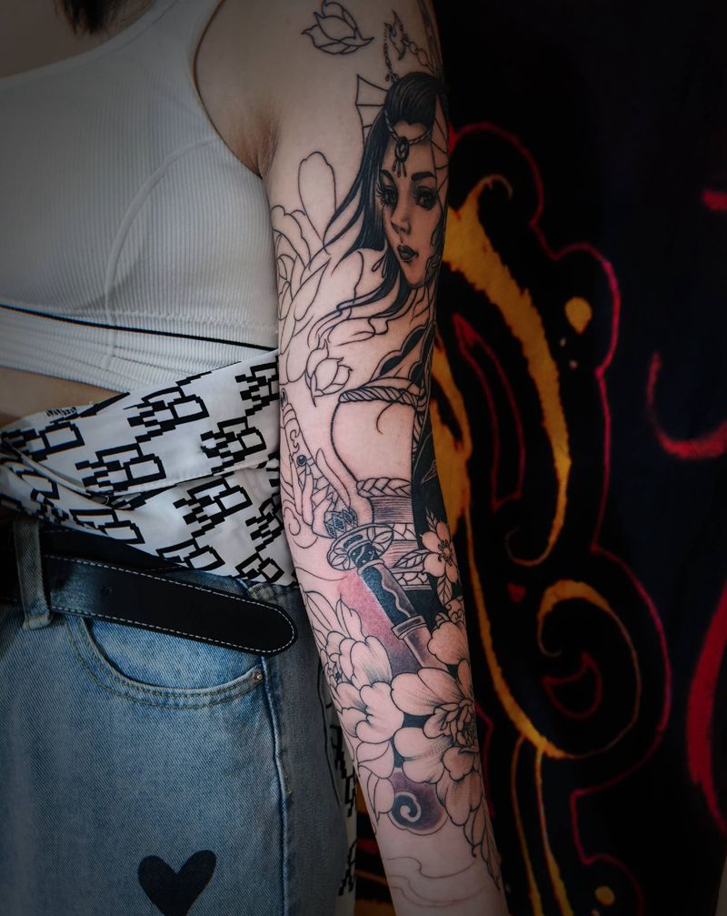 当前位置: 首页 >山东省青岛市纹身店-鬼纹阁刺青纹身图案>艺伎纹身图片_手臂新传统纹身图案