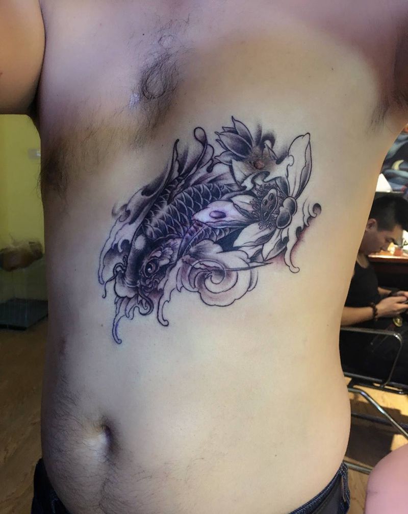 当前位置: 首页 >山东省青岛市纹身店-鬼纹阁刺青纹身图案>锦鲤纹身图片_成品腹部传统动物纹身图案