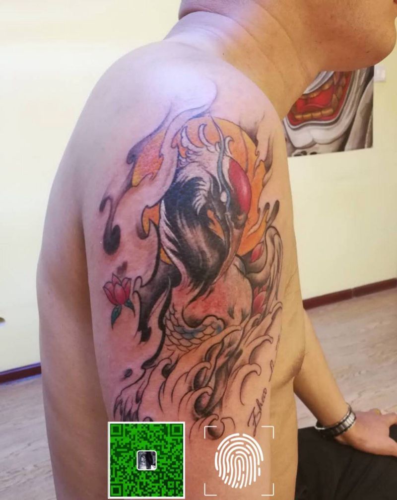 鹤纹身图片_肩部成品传统动物纹身图案