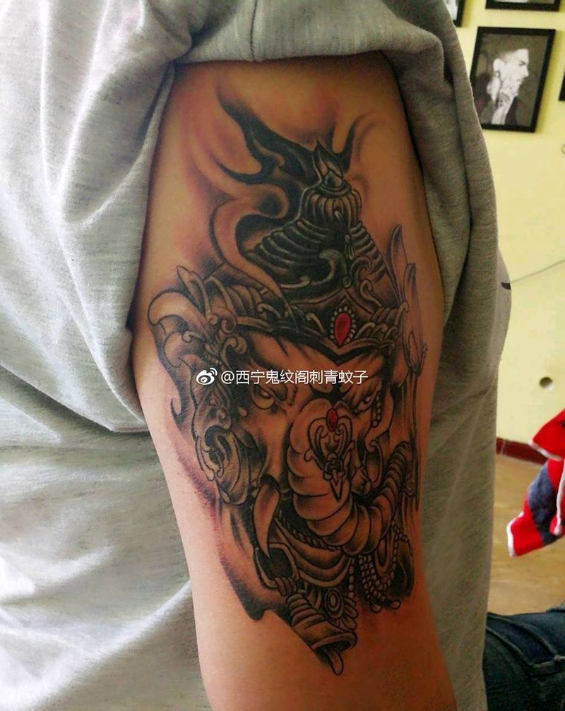 当前位置: 首页 >山东省青岛市纹身店-鬼纹阁刺青纹身图案>象神遮盖纹身图片_肩部传统动物成品纹身图案