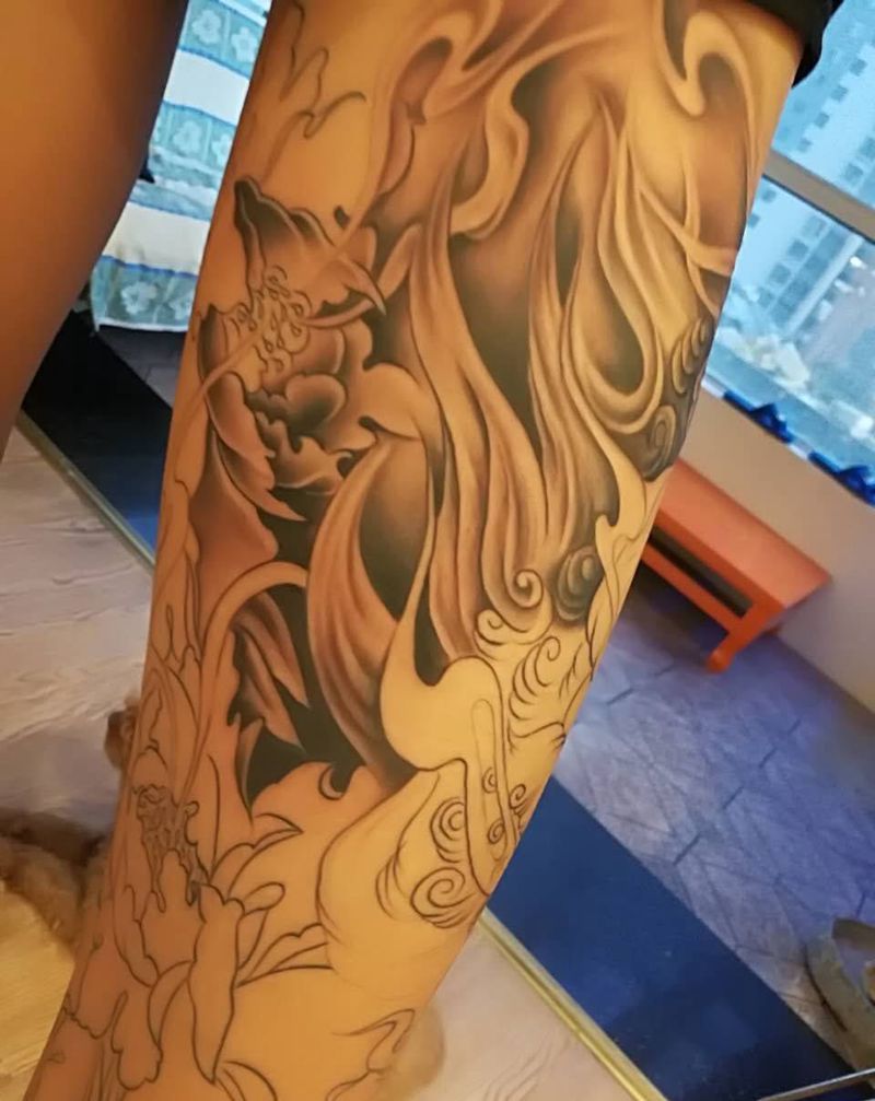 • T网红王老大花腿龙纹身图片_腿部新传统纹身图案