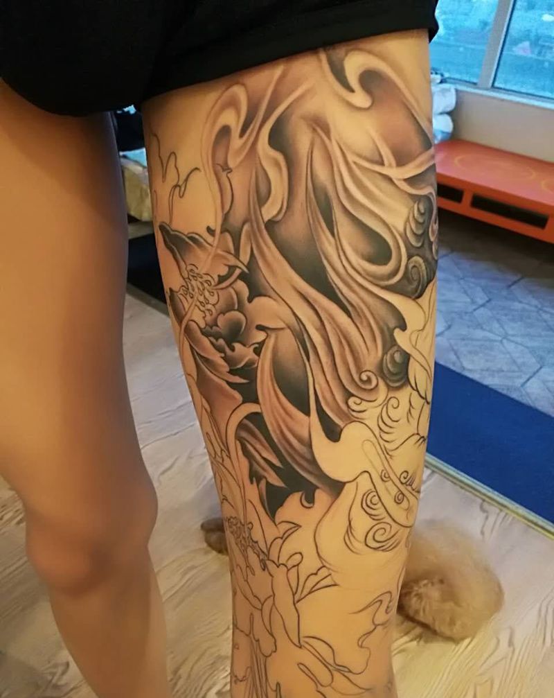 • T网红王老大花腿龙纹身图片_腿部新传统纹身图案