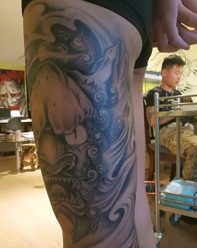 • T网红王老大花腿龙纹身图片_腿部新传统纹身图案