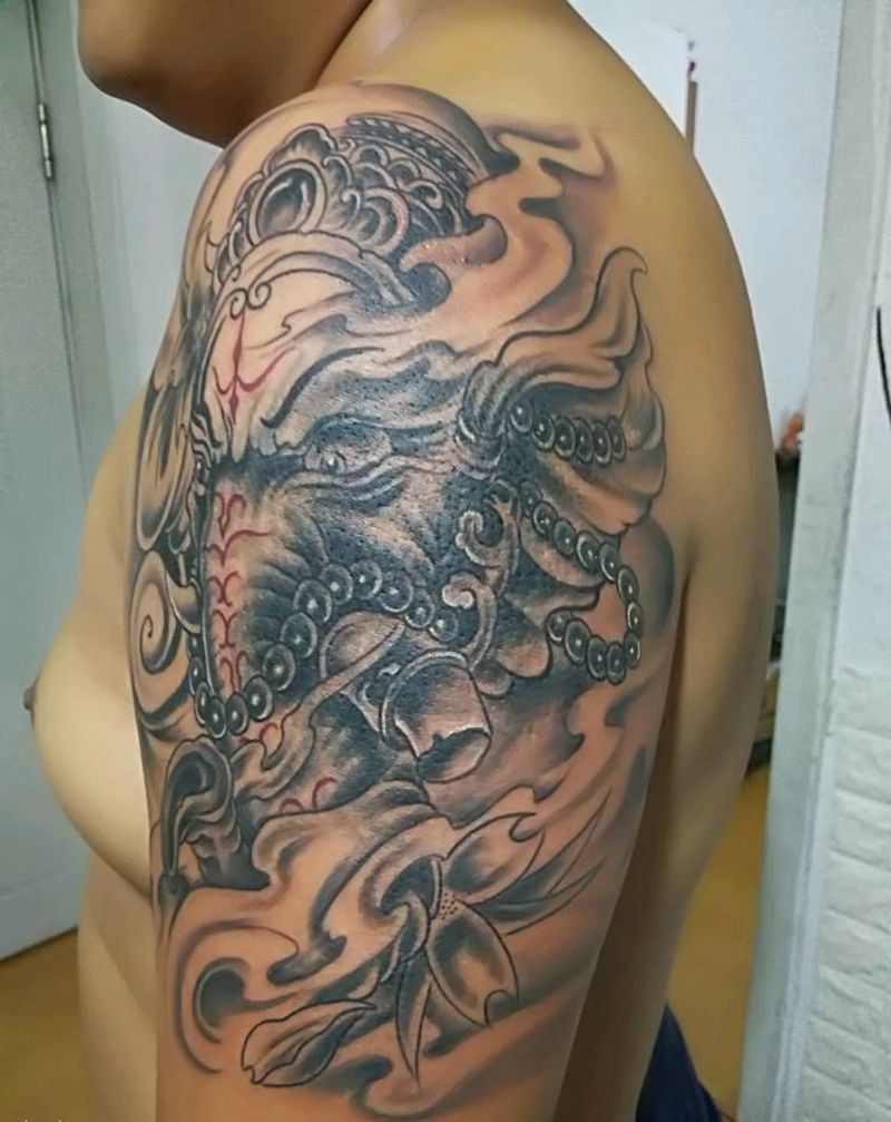 当前位置: 首页 >山东省青岛市纹身店-鬼纹阁刺青纹身图案>遮盖作品象神纹身图片_肩部传统动物成品纹身图案