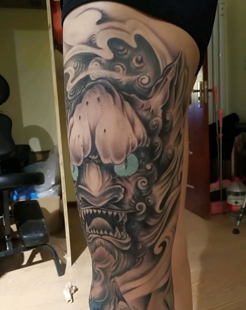 当前位置: 首页 >山东省青岛市纹身店-鬼纹阁刺青纹身图案>唐狮纹身图片