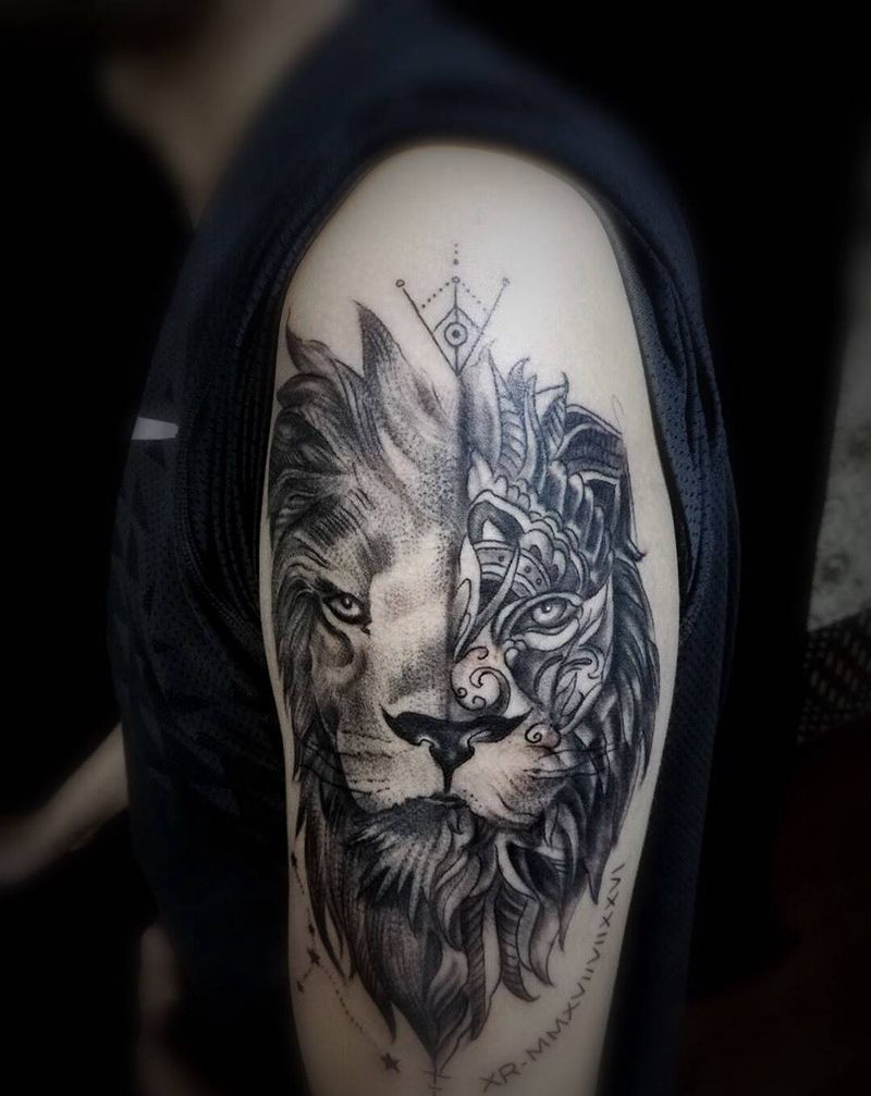 当前位置: 首页 >山东省青岛市纹身店-青岛地狱男爵刺青纹身图案>大臂双面狮王纹身图片_成品手臂欧美动物狮子纹身图案