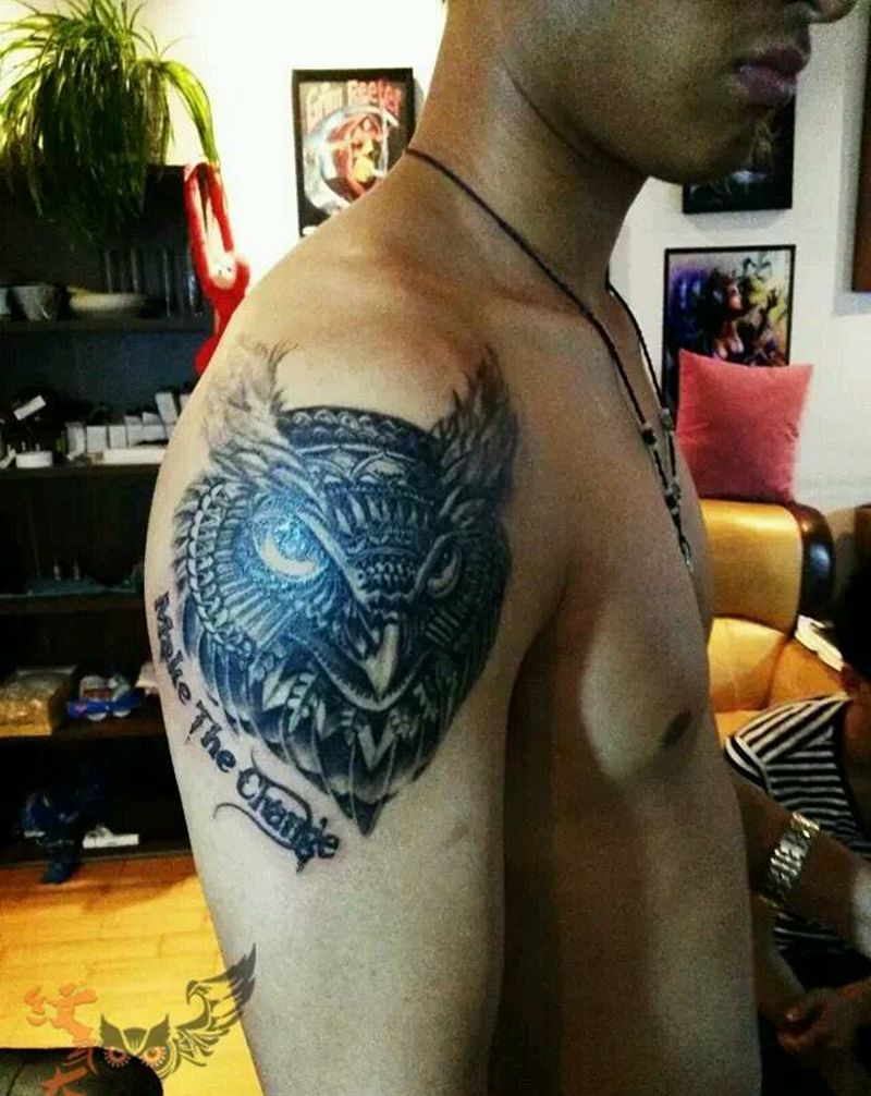 当前位置: 首页 >山东省青岛市纹身店-青岛地狱男爵刺青纹身图案>男士大臂猫头鹰纹身图片