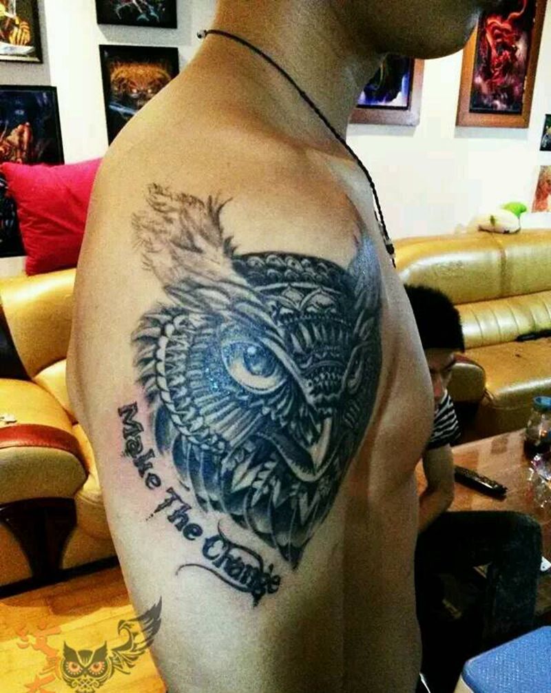 当前位置: 首页 >山东省青岛市纹身店-青岛地狱男爵刺青纹身图案>男士大臂猫头鹰纹身图片